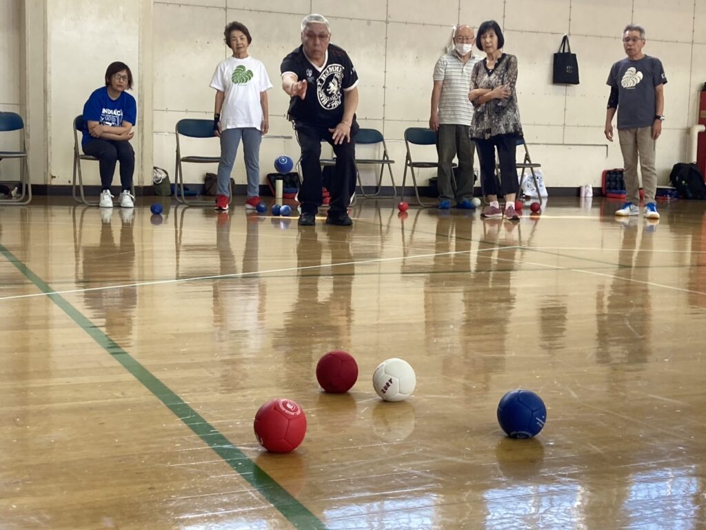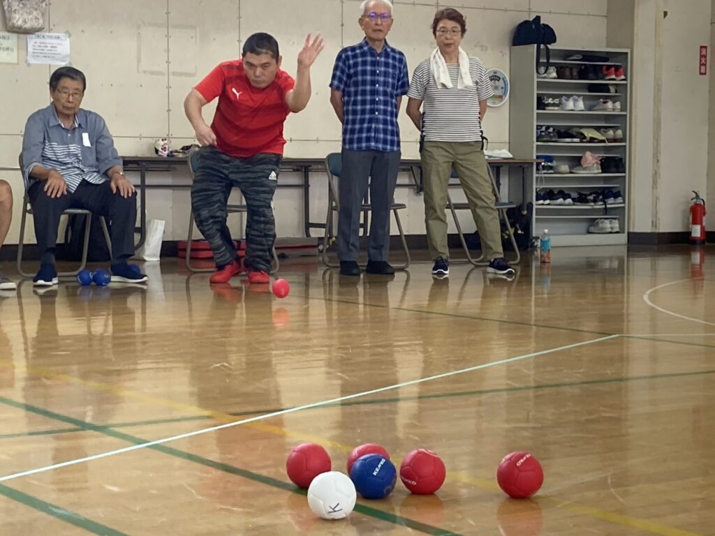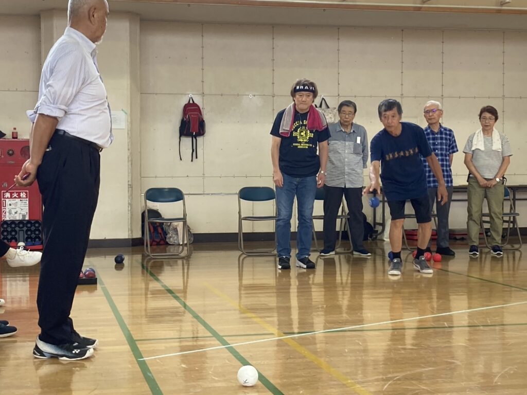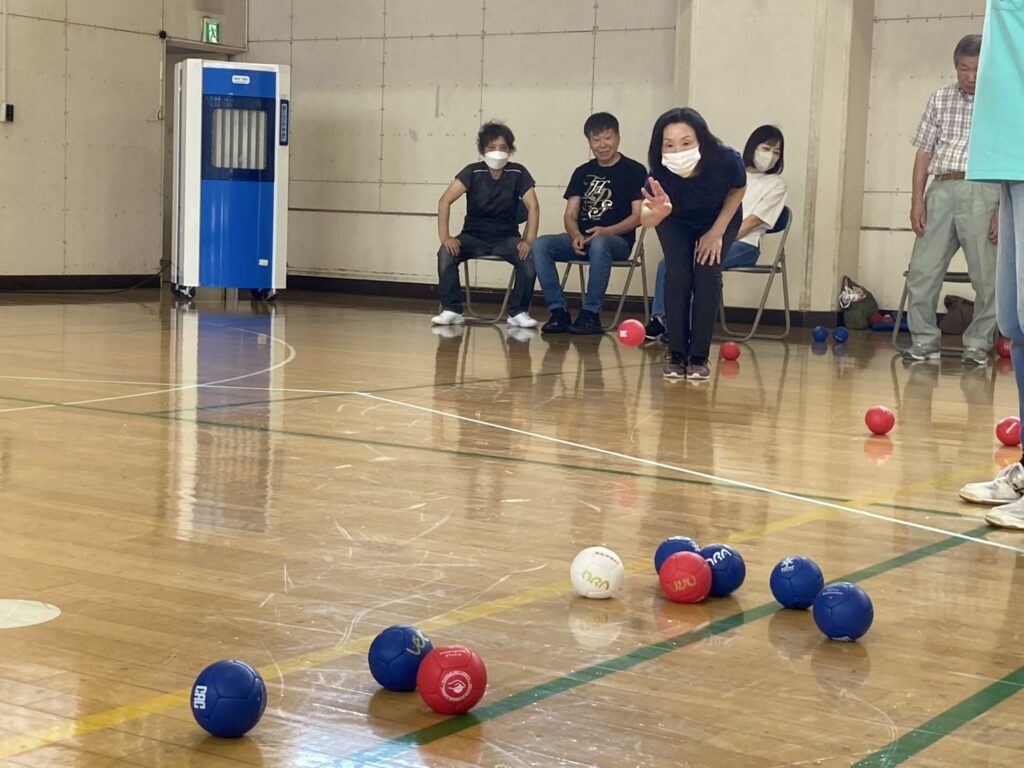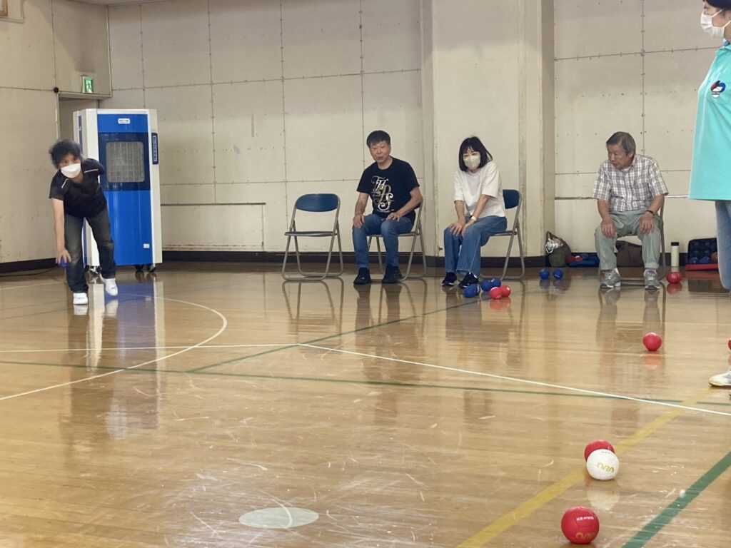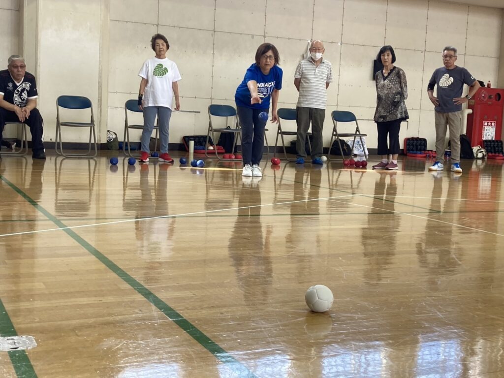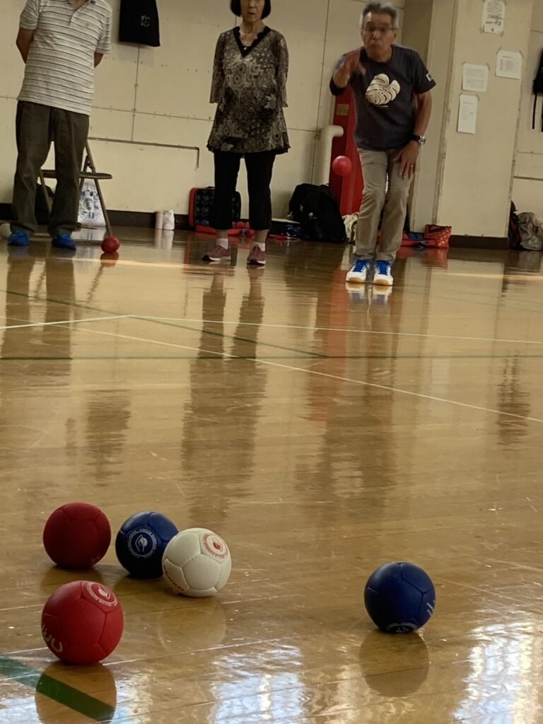 少し蒸し暑かったですがお天気にも恵まれ参加者21名 チーム/3名で2コートにて各4チームでリーグ戦を行いました
