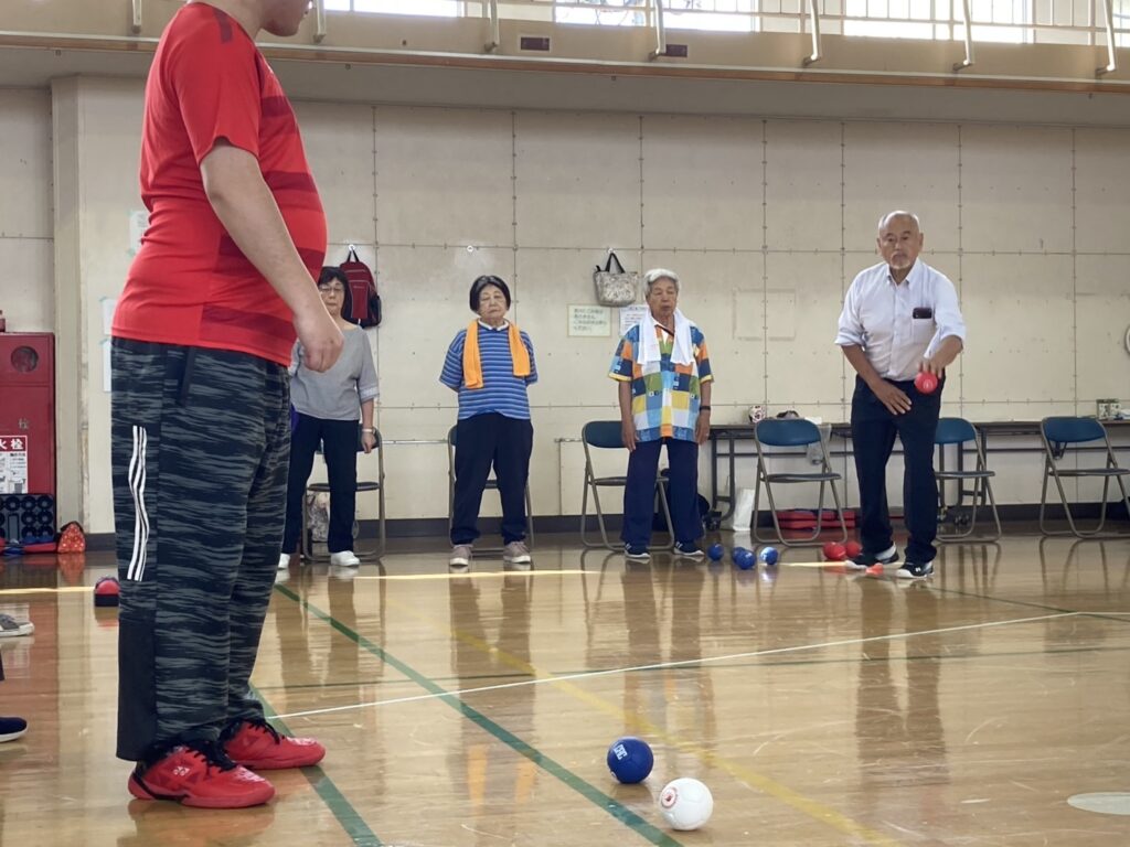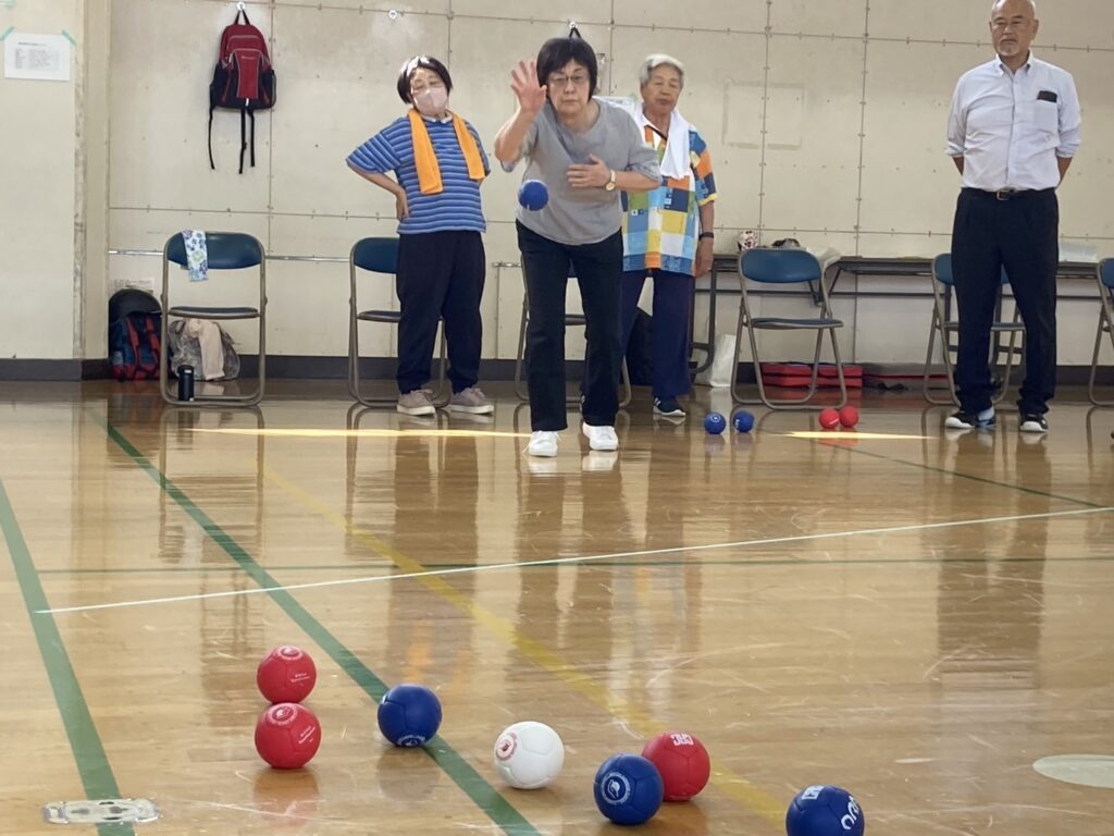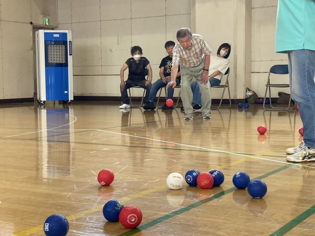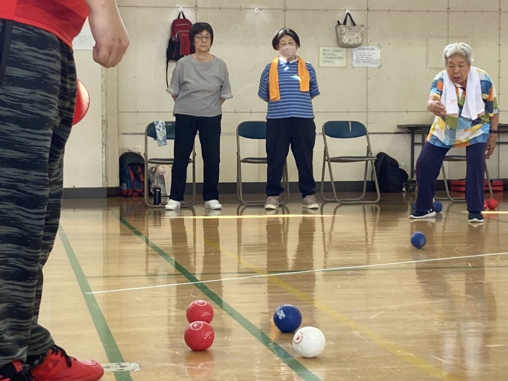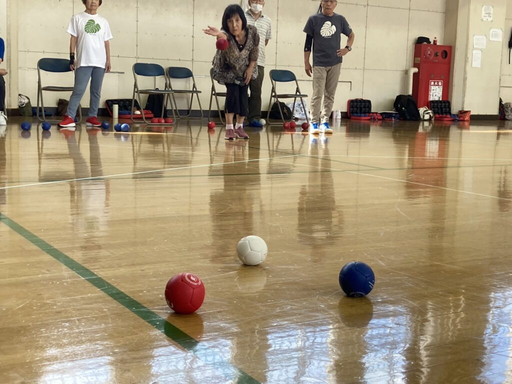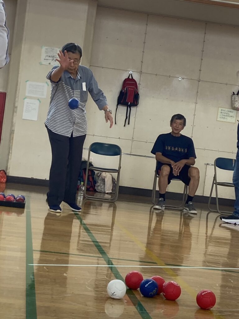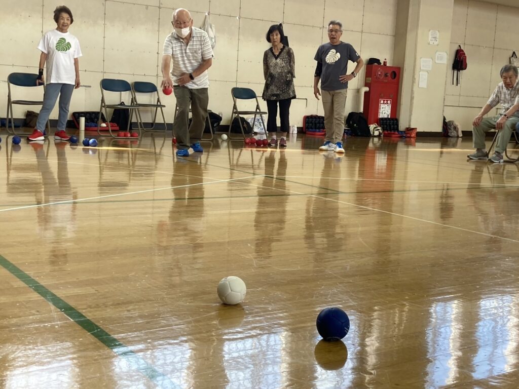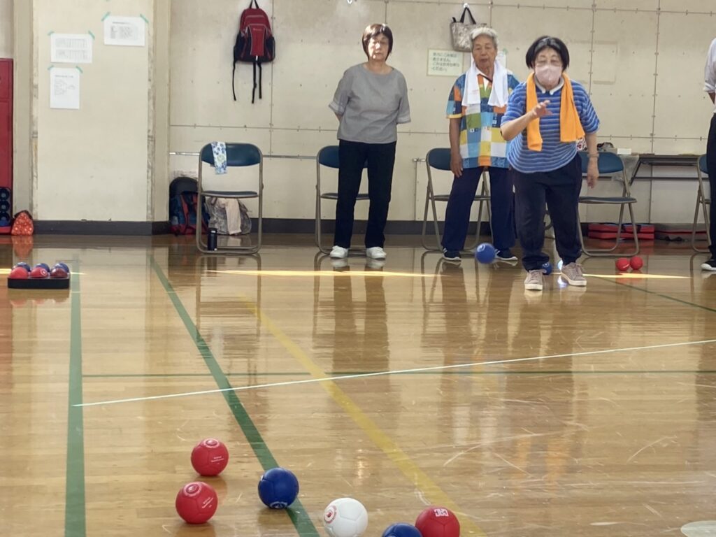 少し蒸し暑かったですがお天気にも恵まれ参加者21名 チーム/3名で2コートにて各4チームでリーグ戦を行いました